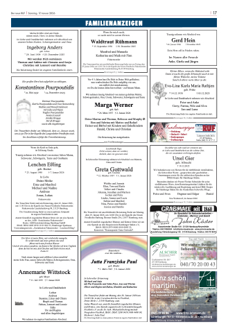Die Trauerfeier mit anschließender Beisetzung findet statt am Freitag, dem 21. Januar 2022, um 14.00 Uhr in der St. Martini Kirche zu Estebrügge. Es gilt die 3-G Regelung (Geimpft, Genesen, Getestet).